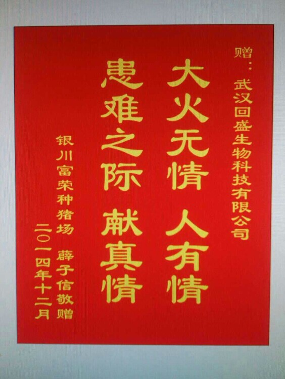 首先,請允許我代表寧夏銀川富榮種豬場全體同事對回盛公司表達最衷心的感謝!2014年12月9日深夜兩點,由于線路老化種豬舍不幸失火,直接損失經產母豬88頭,后備母豬200頭,300多平米的種豬舍毀于一旦,經濟損失達70萬余。