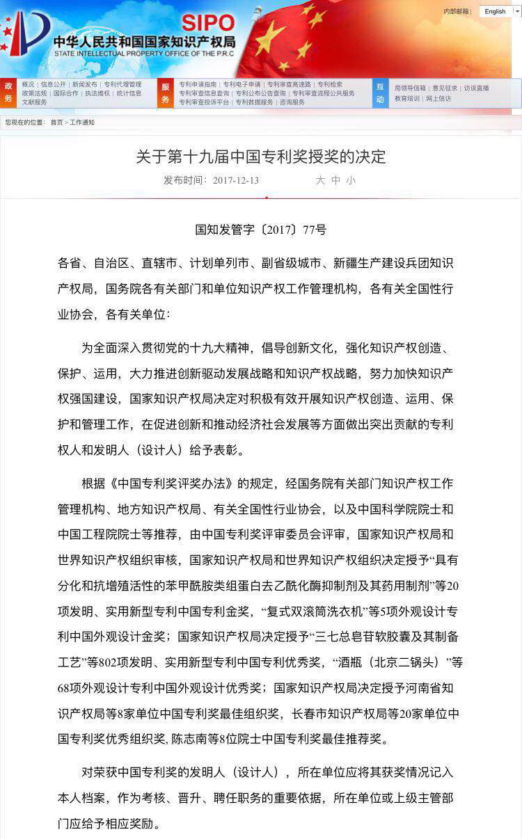 榮獲第十九屆中國發明專利優秀獎,是孝感歷史上專利榮獲的最高獎項。