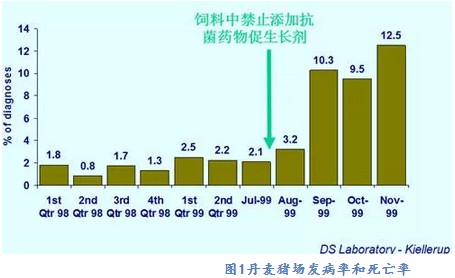 歐盟對獸用抗菌藥在養殖業上的使用要求比較嚴格。瑞典是最早在飼料中禁止添加抗菌藥物促生長劑的國家,從1999年7月1日起歐盟禁止桿菌肽鋅、螺旋霉素、維吉尼亞霉素和泰樂菌素4種抗生素在畜禽飼料中作為生長促進劑使用,2006年1月1日起歐盟又禁止所有的抗菌藥物促生長添加劑在養殖業上使用。然而禁止使用抗菌促生長劑對動物健康和動物福利產生了很大的負面影響,丹麥DANMP的報道(2000年)指出禁用后丹麥豬場的發病率和死亡率增加了600%,如圖1所示。禁用后導致整個歐盟家禽的壞死性腸炎呈流行狀態,飼料報酬下降,上市體重和整齊度降低,大大提高了生產成本。
