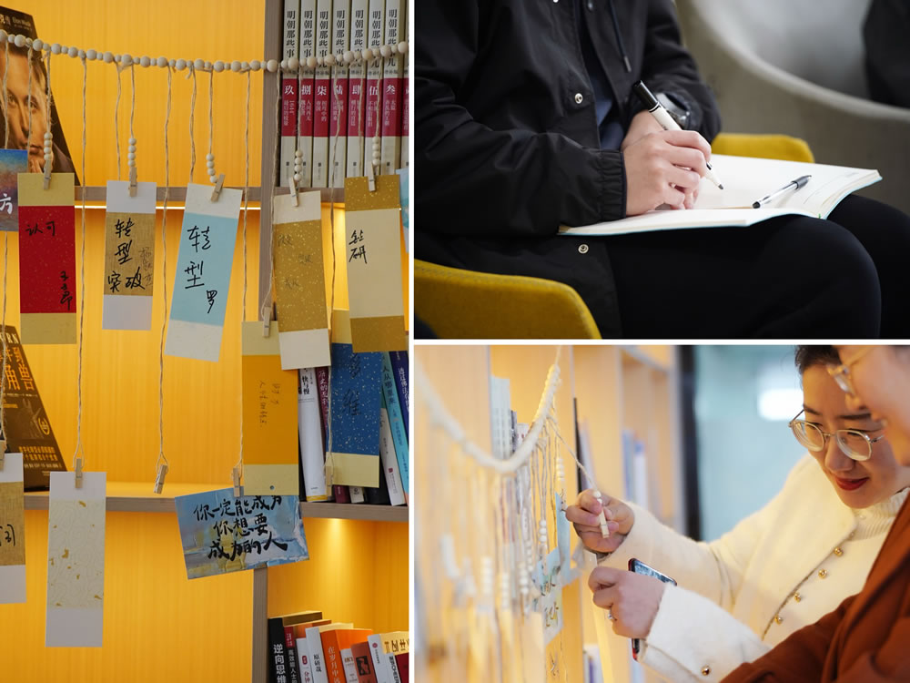 活動開場后,每位參與者以“2025年最想突破的職場關鍵詞”為引,寫下新年的成長期許。回盛書友們將關鍵詞書簽懸掛于讀書室主題墻,再以"可落地行動項+計劃閱讀書目"構建年度閱讀企劃。